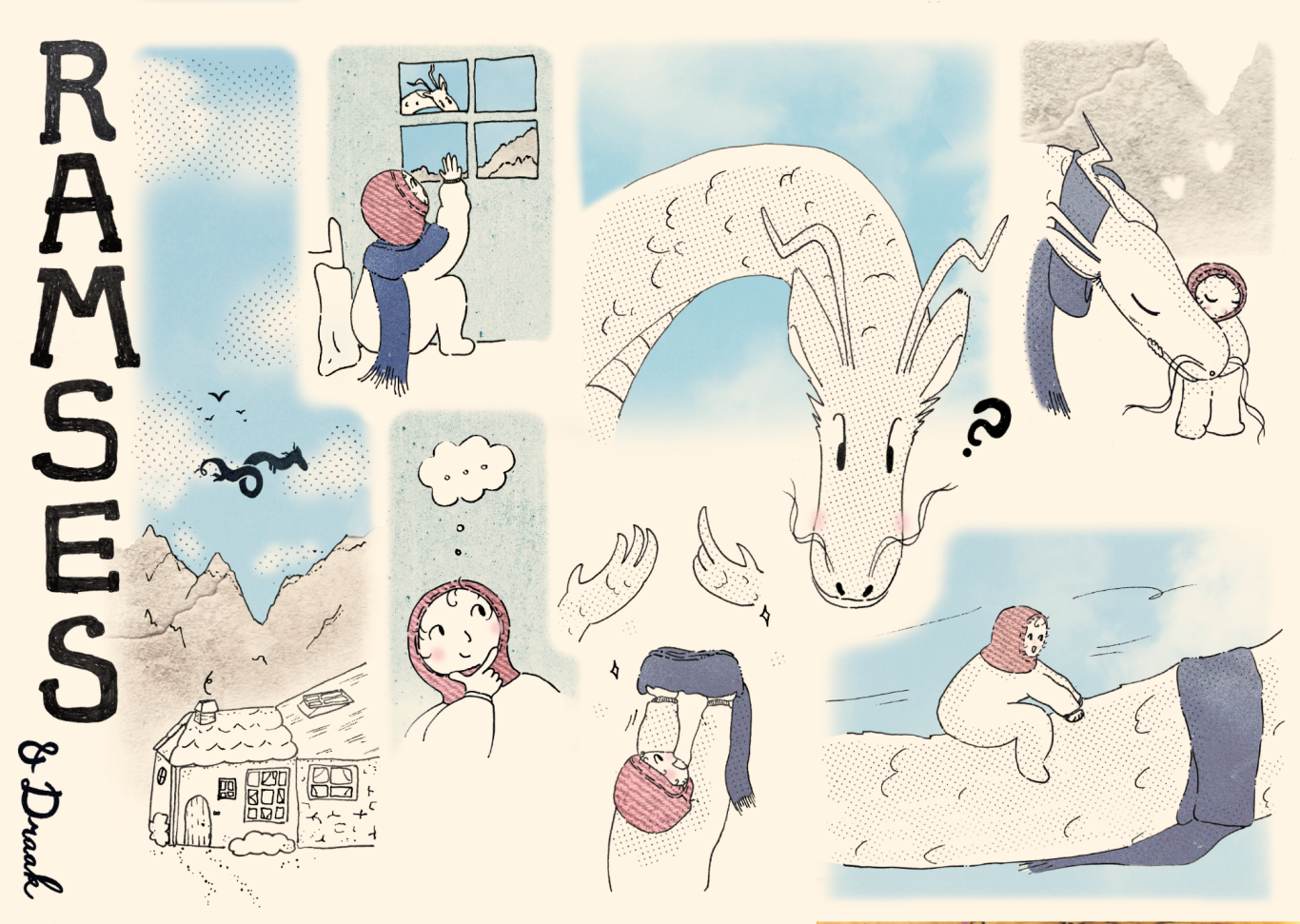 all the drawings were drawn by hand on paper, scanned in and coloured in with various textures and existing photos